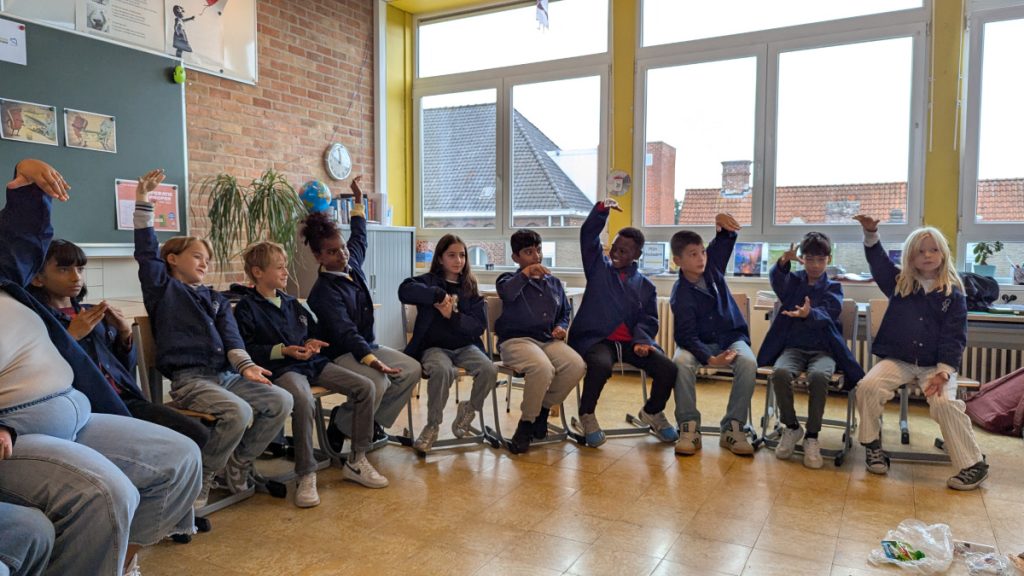 Gekoppeld aan onze boekenbeurs kwam Brigitte Minne ons warm maken voor haar boeken. Ze deed dat op een heel enthousiaste en uitbundige manier. Alle kinderen gingen helemaal op in haar verhalen.