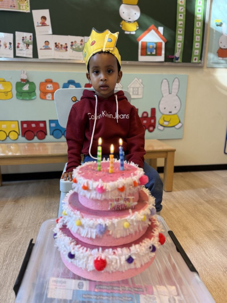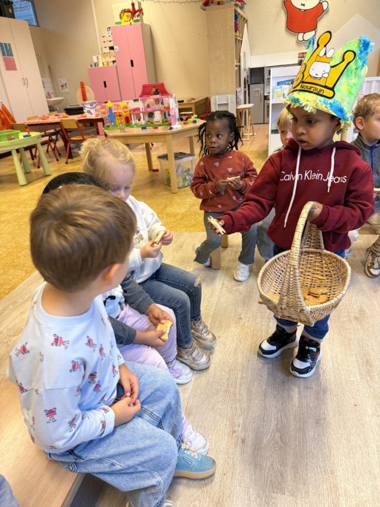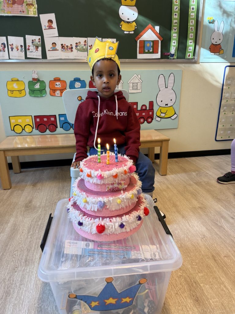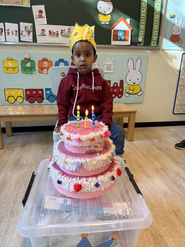Nourayn mocht ook 3 kaarsjes uitblazen. We maken een kroon, zingen en dansen en Nourayn mag trakteren met de koekjes.